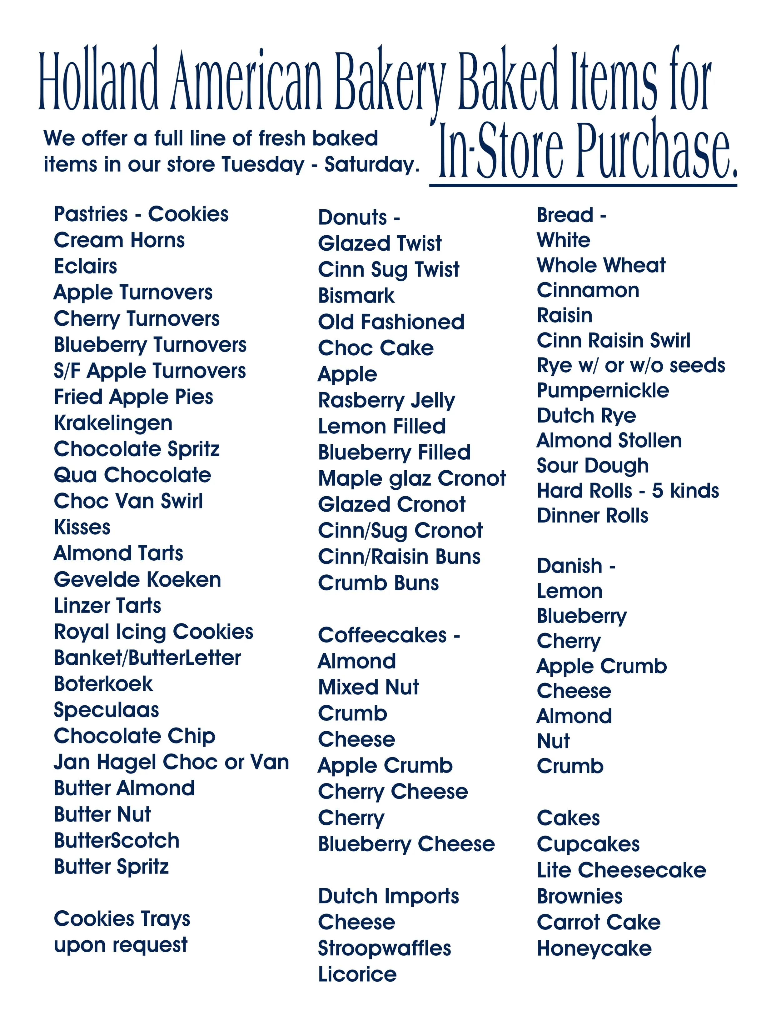 In Store we offer a full range of fresh baked goods Tuesday - Saturday. See below for photos & a list of specific items.